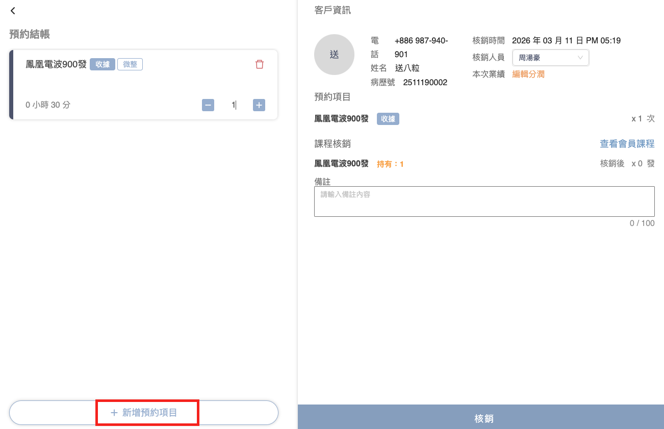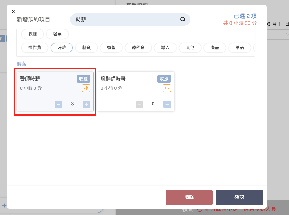 1. 加入時薪項目： 在「核銷」頁面，點選 `[+ 新增預約項目]` 並選取「醫師時薪」。