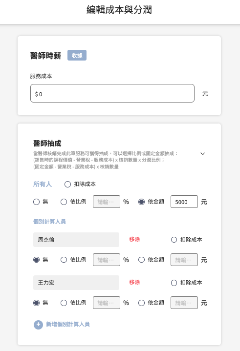 4. 個別人員時薪調整： 若各醫師時薪不同，可利用 `[+ 新增個別計算人員]` 功能，為周杰倫、王力宏等不同醫師設定其專屬的時薪標準。