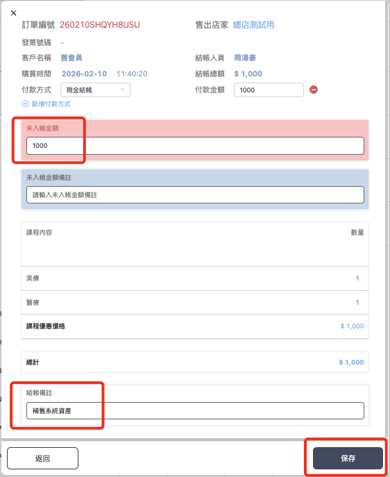 3. 保存設定：點擊儲存後，該筆訂單在列表中會顯示對應的未入帳金額。