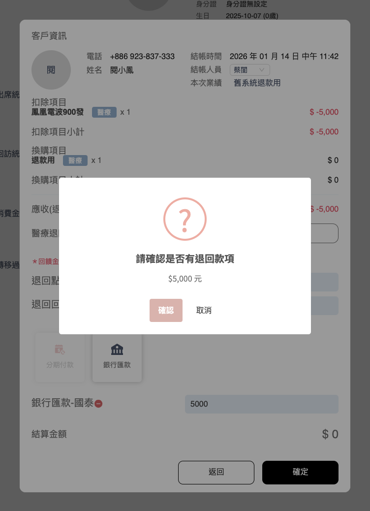* 系統會自動計算差額，左下角應顯示紅字的負數金額（例如：應收(退) -5,000 元），代表診所需要退錢給客人。