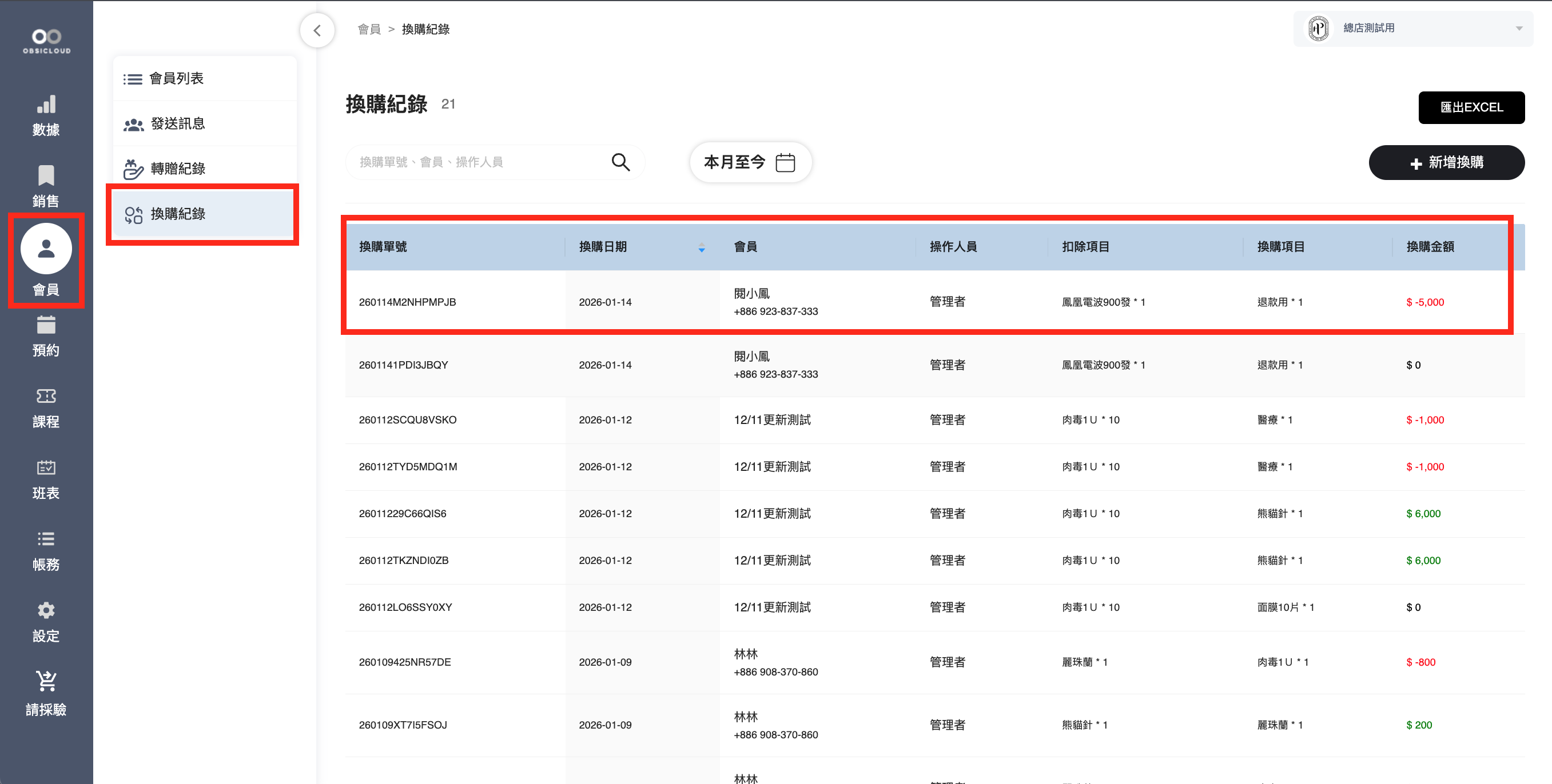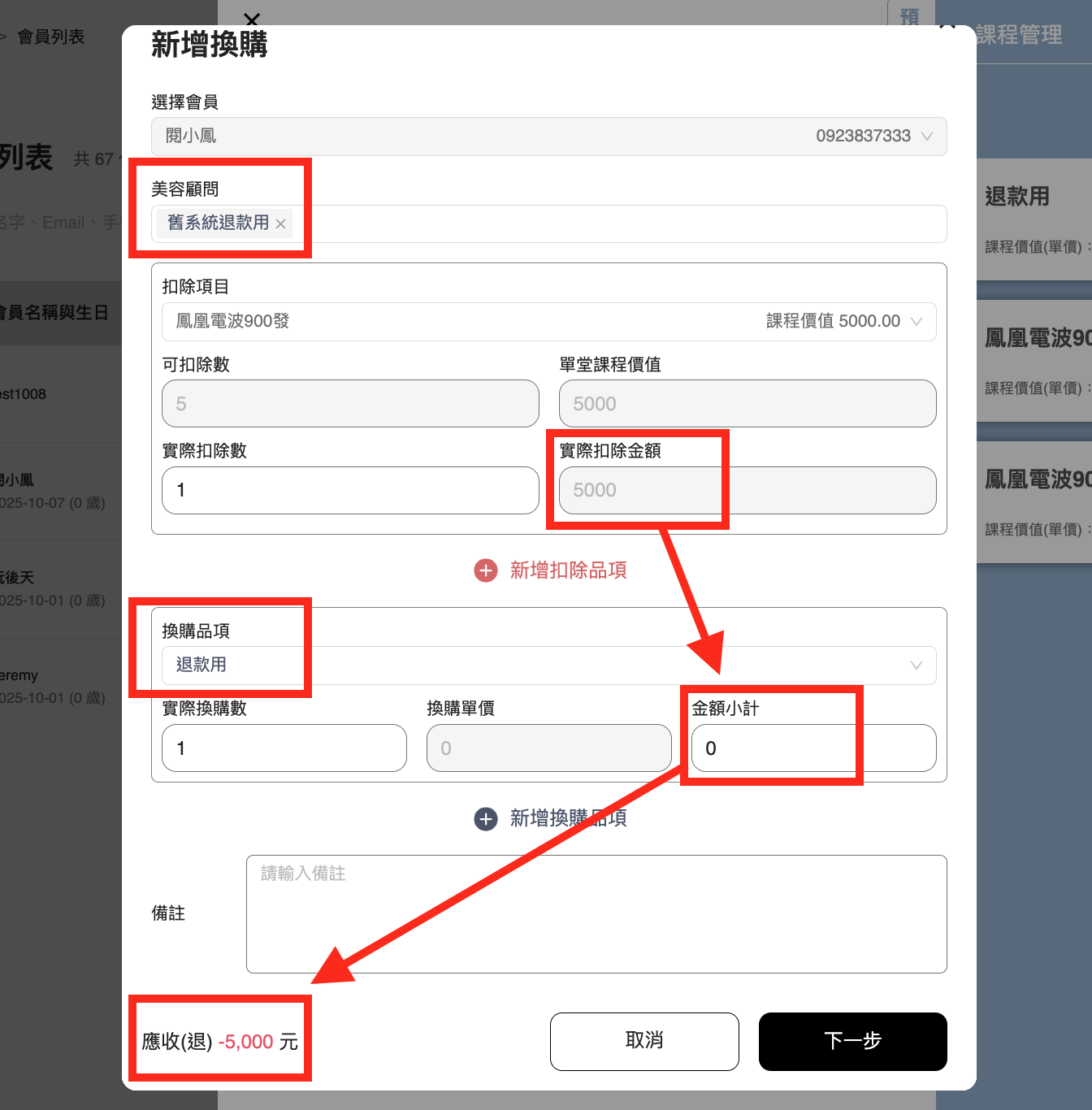 * 換購金額：顯示負數（例如：$-5,000），代表已成功立帳退款。