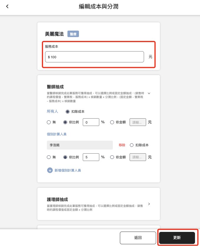 * 可針對 醫師、護理師、美容師 分別設定該服務的操作酬勞。