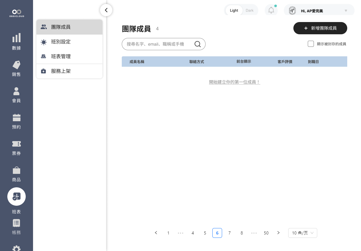 1. 若要新增團隊成員，請點選左側側邊欄的「班表」並點擊「團隊成員」。