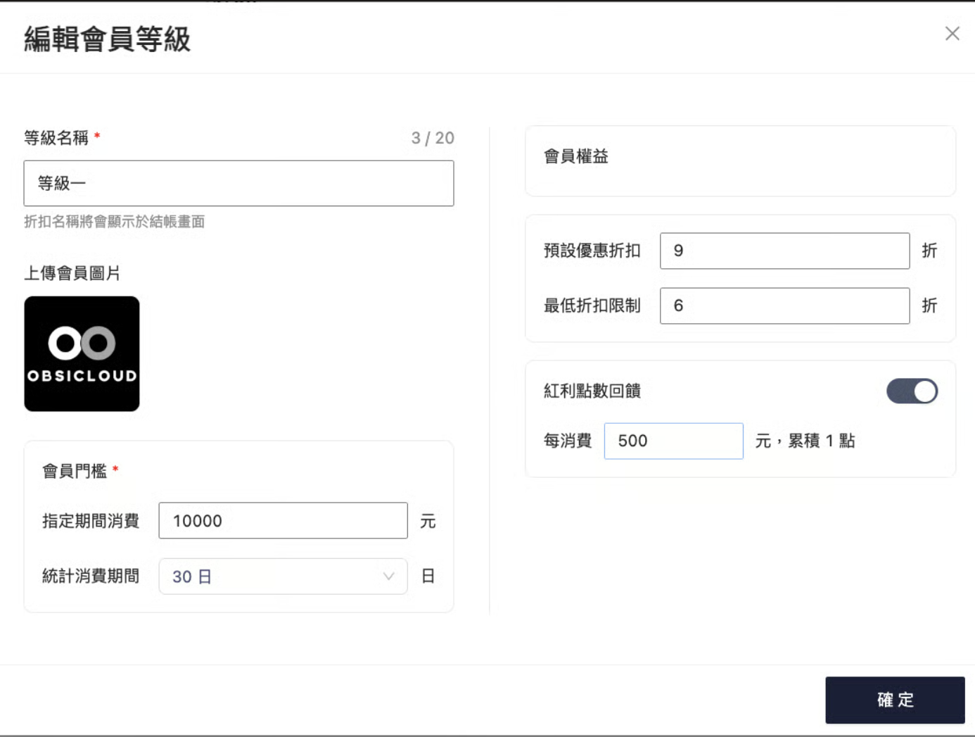* 預設優惠折扣：設置該等級享有的常態折扣（如 9 折、8.5 折）。