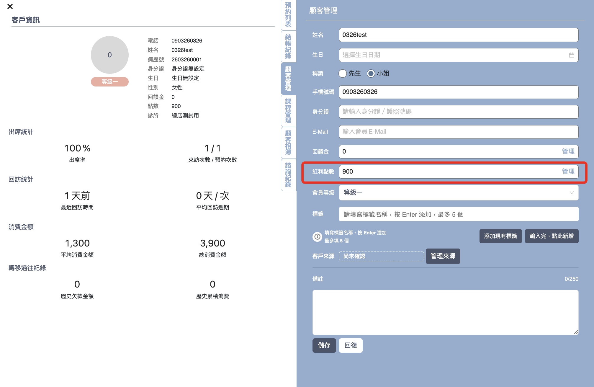* 紅利點數回饋：設置該等級享有的紅利點數回饋，如可設置“每消費500元，累積 1 點”，此部分消費完成後，紅利點數將直接回饋於會員的帳戶內，可至”客戶資訊頁面“>”顧客管理”，查看紅利點數欄位確認，後續結帳消費時可直接折抵。（請留意紅利點數與回饋金每次消費僅能擇一使用）