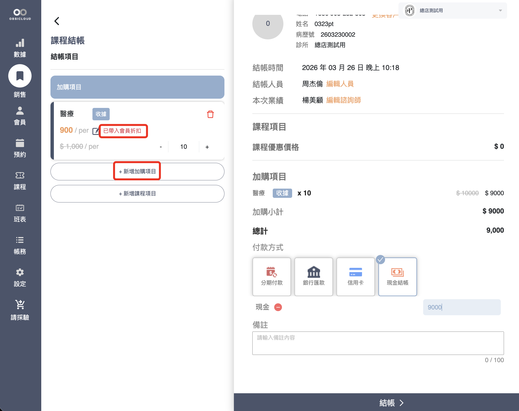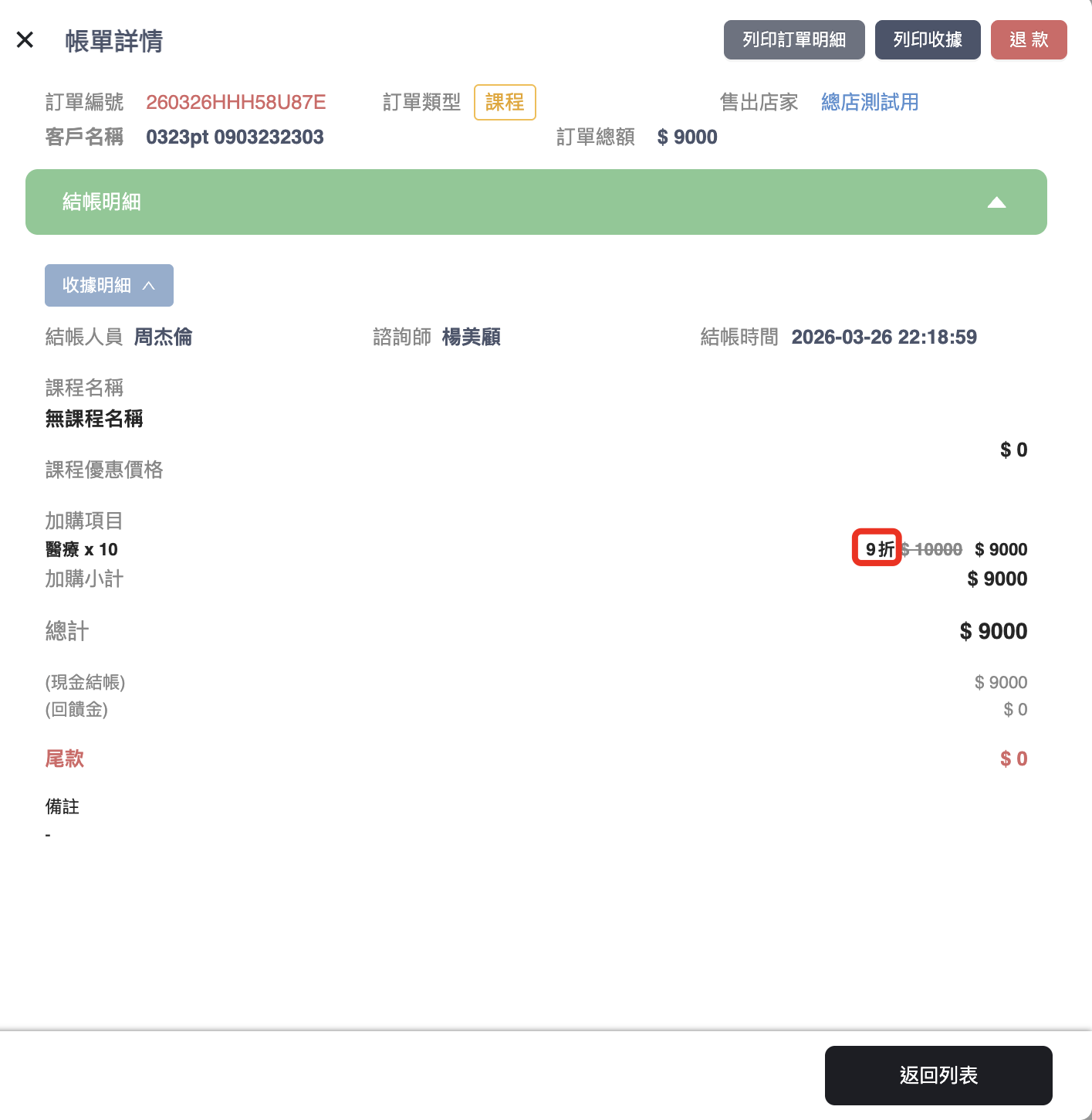 3. 明細核對：結帳完成後，可在「帳單明細詳情」中查閱該筆銷售實際應用的折扣倍數與最終金額。